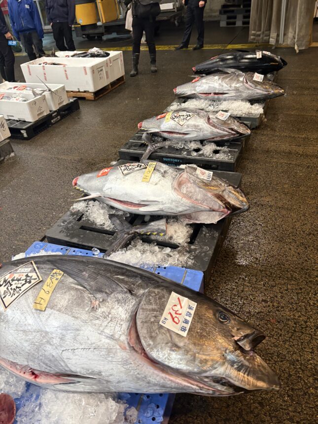 大きなマグロが並ぶ水産物、ブロッコリーやキウイ、冬瓜などが競りにかけられていた青果物、それそれで本年の競りがスタートです。